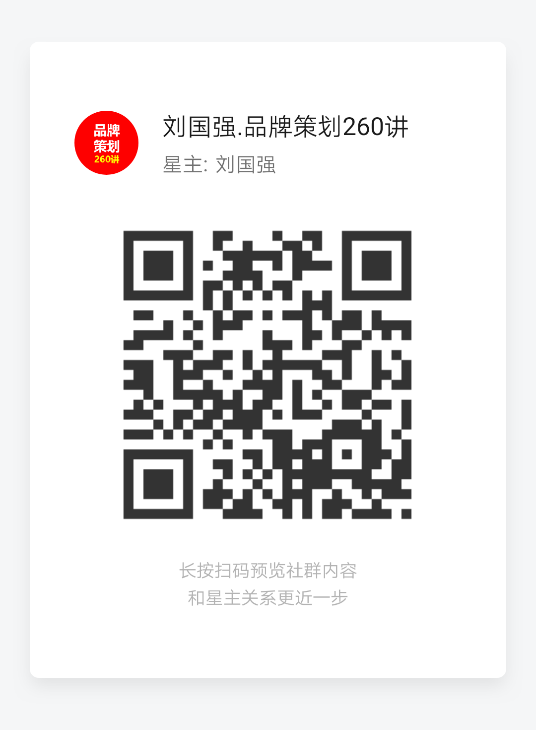 四個欄目功能的詳細講解及案例演示,請掃碼加入老劉在知識星球的《劉國強.品牌策劃260講》,獲取完整版。