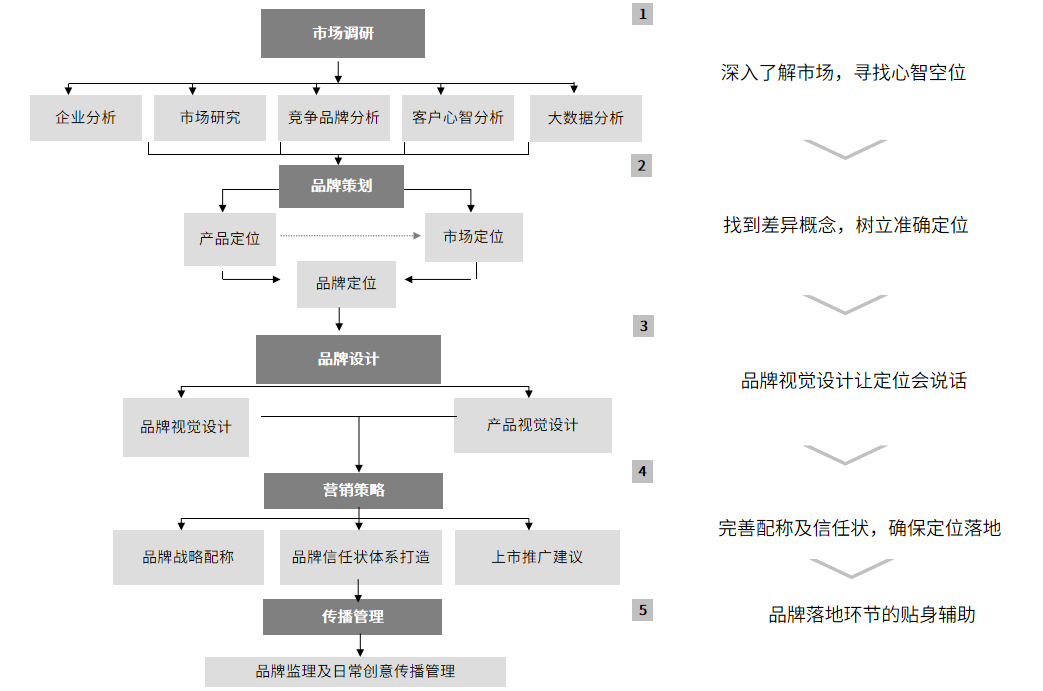 內(nèi)訪外調(diào)(發(fā)現(xiàn)市場真相,尋找策劃依據(jù)。)——整體定位(圍繞市場、產(chǎn)品、品牌進(jìn)行系統(tǒng)定位)——視覺包裝(依據(jù)定位,進(jìn)行產(chǎn)品及品牌創(chuàng)意包裝)——營銷策略(整體及區(qū)域市場的開拓策略)——上市方案(產(chǎn)品上市的具體執(zhí)行方案)——營銷管理(市場及銷售體系的搭建)